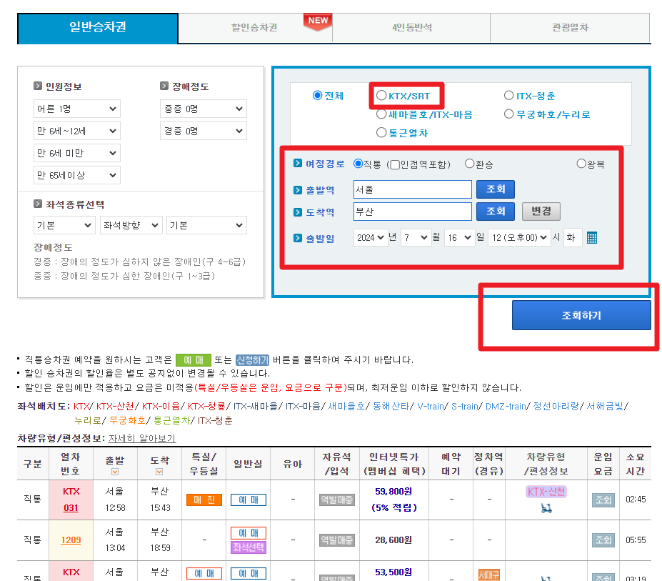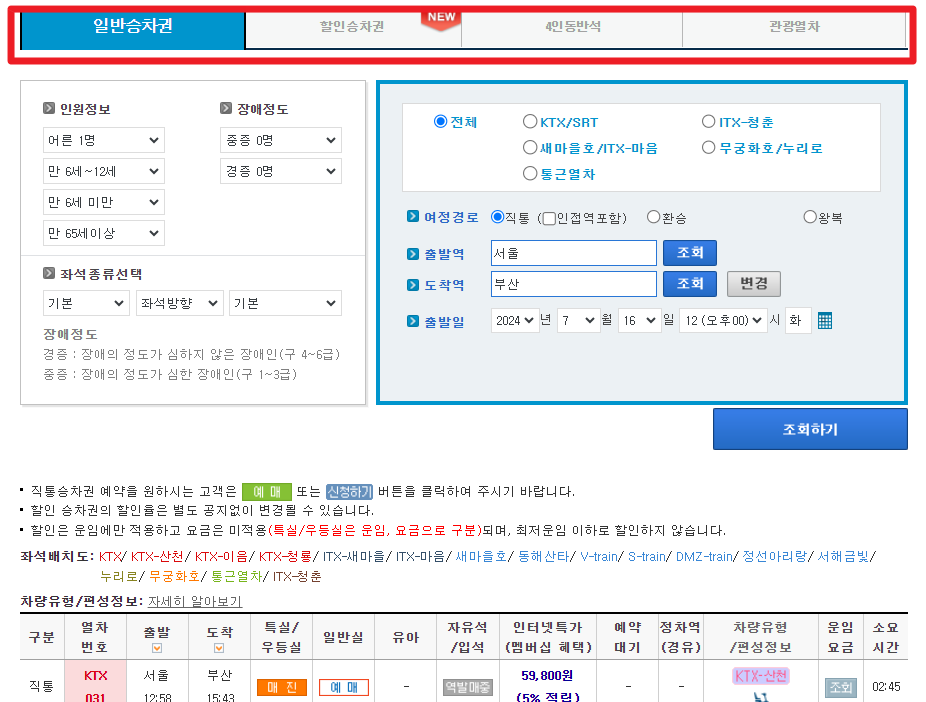 일반 승차권의 경우 그대로 작성해서 ktx열차 시간표 확인 후 예매하면 되지만 만약 경로자라던지 두자녀 가정의 경우 좀더 승차권 가격이 내려갑니다.