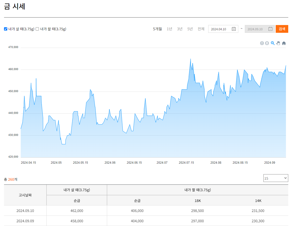 위 그래프는 최근 5개월 동안의 금 시세 변동을 보여줍니다. 그래프의 Y축(세로축)은 금 1돈(약 3.75g)의 가격을 나타내고 있으며, X축(가로축)은 2024년 4월 중순부터 2024년 9월 초까지의 날짜를 표시합니다.