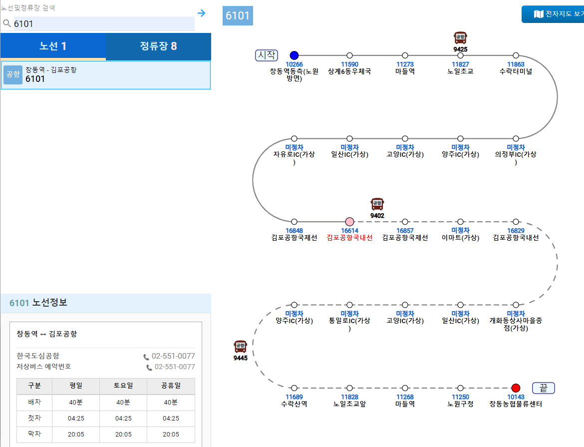 위 버튼을 클릭 후 6101번의 리무진버스를 조회해보았습니다. 현재 노일초교, 그리고 김포공항 국내선에 위치해 있는 버스를확인할 수 있습니다. 내가 만약 수락터미널에 있다면 전 정거장에 버스가 위치해있으므로 미리 파악할 수 있다는 장점이 있습니다.