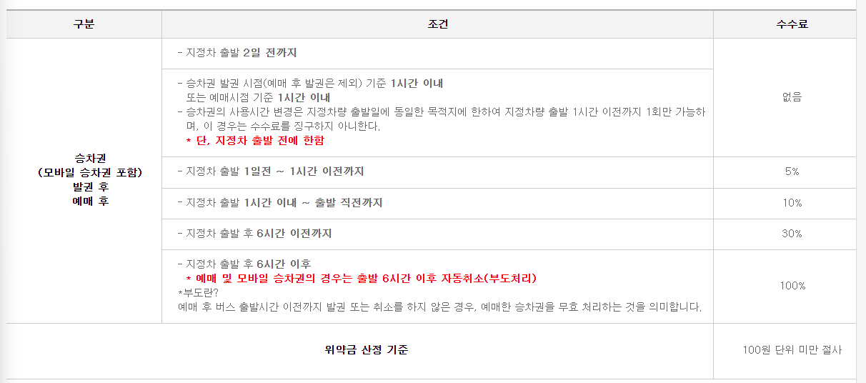 승차권은 지정차 출발 2일 전까지 취소할 경우 수수료는 없으나 그 이후부터는 취소 수수료가 부과될 수 있습니다. 버스 요금이 생각보다 높기 때문에 이렇게 위약금 산정 기준을 미리 참고하시고 이용하지 않게 될 경우 미리 미리 취소하시기 바랍니다.