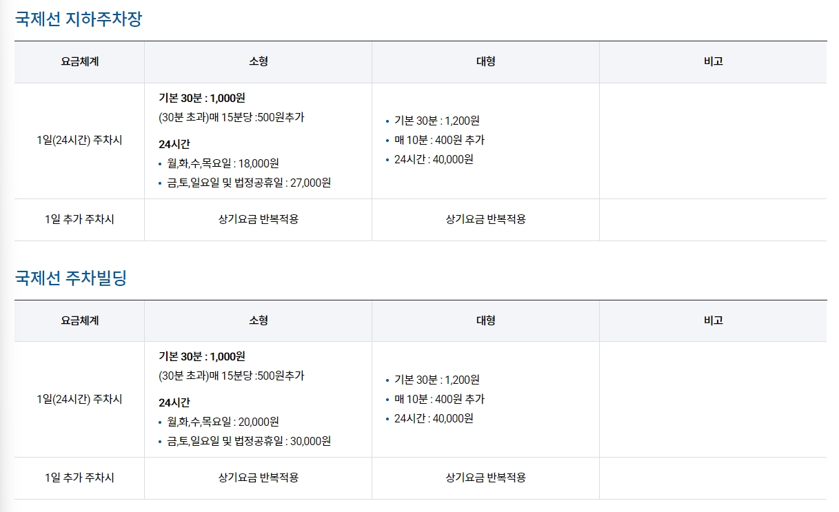 국제선 주차장 요금은 24시간 하루 주차할 경우 평일 18,000원이며 금요일부터 주말 및 법정 공휴일의 경우 27,000원입니다. 국제선의 경우 지하주차장과 주차빌딩으로 구분되어 있습니다.
