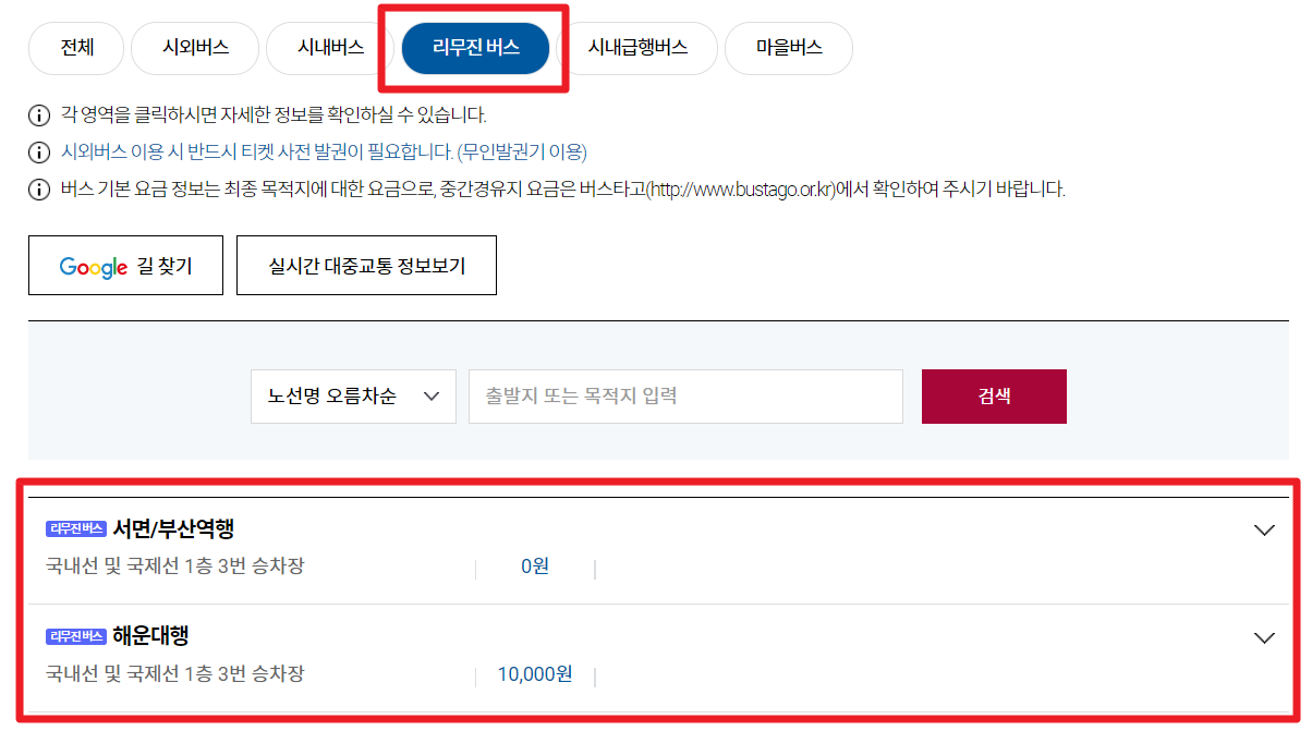 이처럼 위 버튼 클릭 후 [리무진 버스]를 클릭해줍니다. 확인해보니 부산역과 해운대로 가는 리무진버스가 있는데요, 만약 다른 지역으로 가길 원하시는 분들은 시외버스나 시내버스, 그리고 시내급행버스를 이용하셔야합니다.