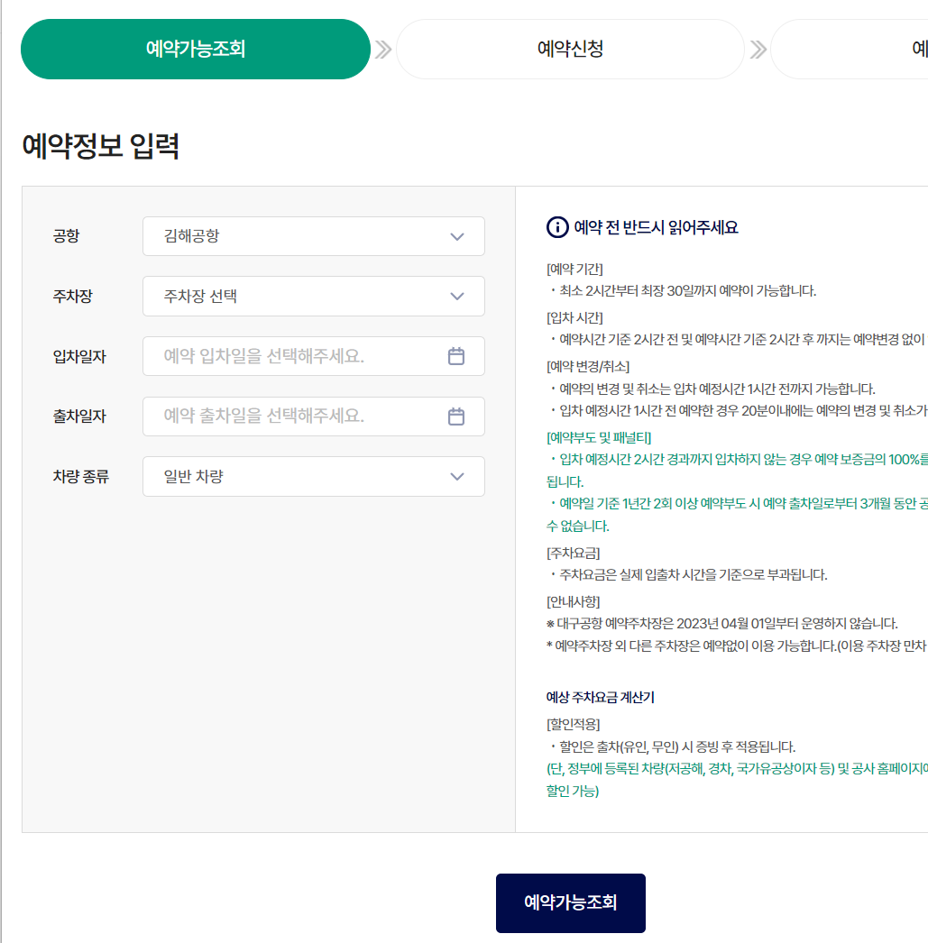 김해공항의 경우 최소 2시간 전부터 최장 30일 까지 예약할 수 있습니다. 예약시간 기준 2시간 전 그리고 기준 2시간 후까지는 예약 변경 없이 입차할 수 있습니다.