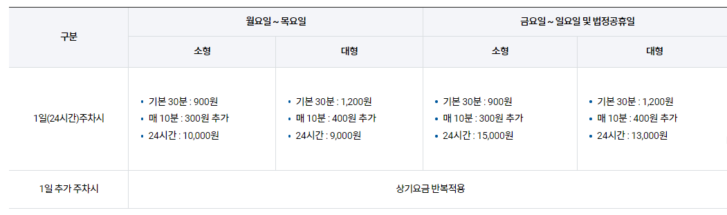 P1, P2 주차장 요금은 다음과 같습니다. 월요일부터 목요일까지는 기본 30분은 900원, 그리고 10분당 300원씩 추가됩니다. 24시간 온종일 주차할 경우 1만원이며 금요일부터 일요일까지 24시간 주차시 15,000원 입니다.