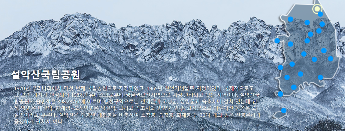 설악산은 유네스코에 지정되어있으며 하루에도 몇 천명에 다다른 관광객과 등산객으로 유명한 산 인데요, 집 안에서도 편하고 간단하게 설악산 국립공원을 만나볼 수 있습니다.