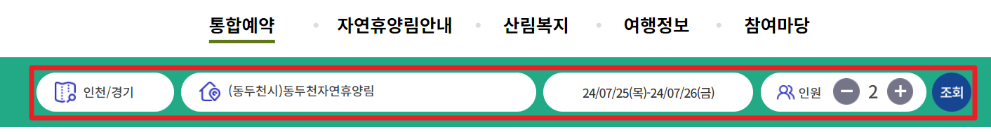 로그인 후 예약을 위해서 내가 원하는 자연휴양림 / 날짜 / 인원 수 등을 입력 후 조회를 해줍니다.