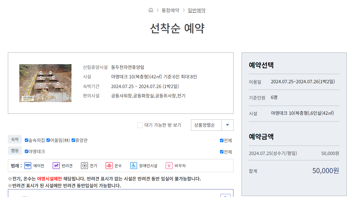 예약이 가능하다면 아래와 같이 예약선택 한 내용을 확인 후 예약금액 체크한다음 [예약하기]를 클릭해주시면 됩니다.