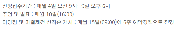 숲나들e 국립자연휴양림 추첨은 다음달 1일 ~ 말일 중 주말에 한하여 추첨제로 예약을 받고 있습니다. 매월 4일 오전 9시부터 매월 9일 저녁 6시까지 신청을 해두면 추첨을 통해 10일 오후 4시에 발표가 진행됩니다.
