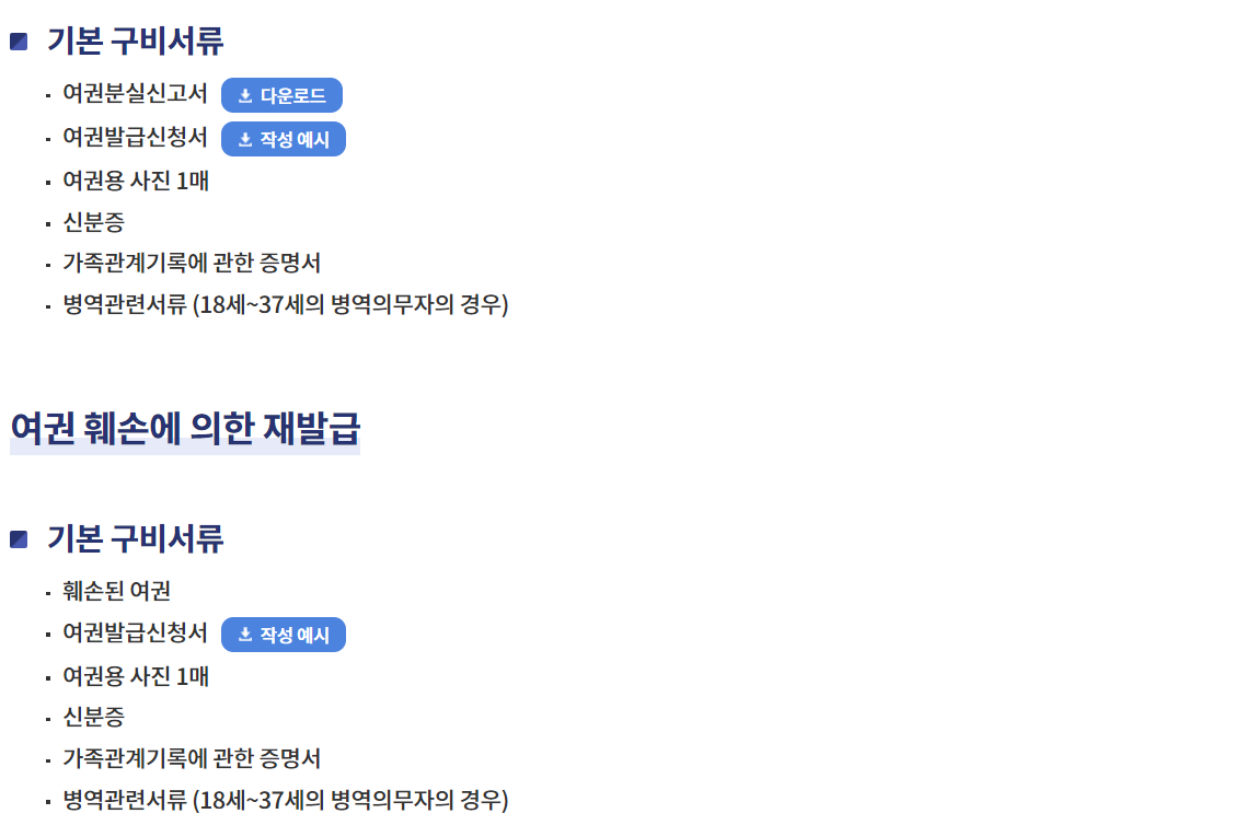 여권 분실 또는 훼손으로 인해 재발급이 필요하신 분들은 아래와 같은 준비물을 준비하시기 바랍니다. 공식적인 입출국 관련한 낙서나 스탬프가 아닌 경우 항공권 발권이나 외국 출입국에 제한이 있을 수 있기 때문입니다.