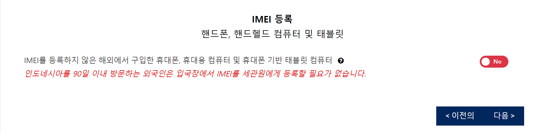 90일이내 머물 경우 등록하지 않아도 되니 NO로 그대로 두고 다음을 클릭해줍니다.