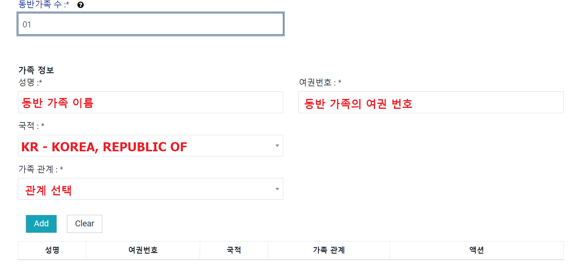 여기에서 동반 가족수를 2명 입력할 경우 동반 가족 수에 따라 아래 입력할 수 있는 창이 열립니다. 함께 여행에 동반하는 가족 정보를 추가로 입력해줍니다.