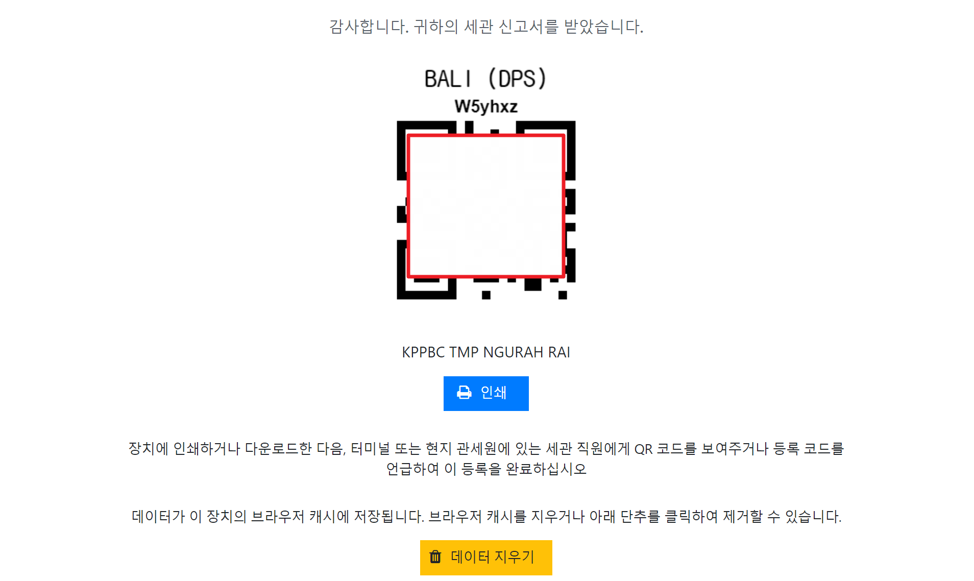 모든 절차가 끝났습니다. 물품 반입에 대한 규정을 이해했냐는 것을 동의 체크 후 보내기 버튼을 클릭하면 아래와 같은 QR코드를 발급받을 수 있습니다.