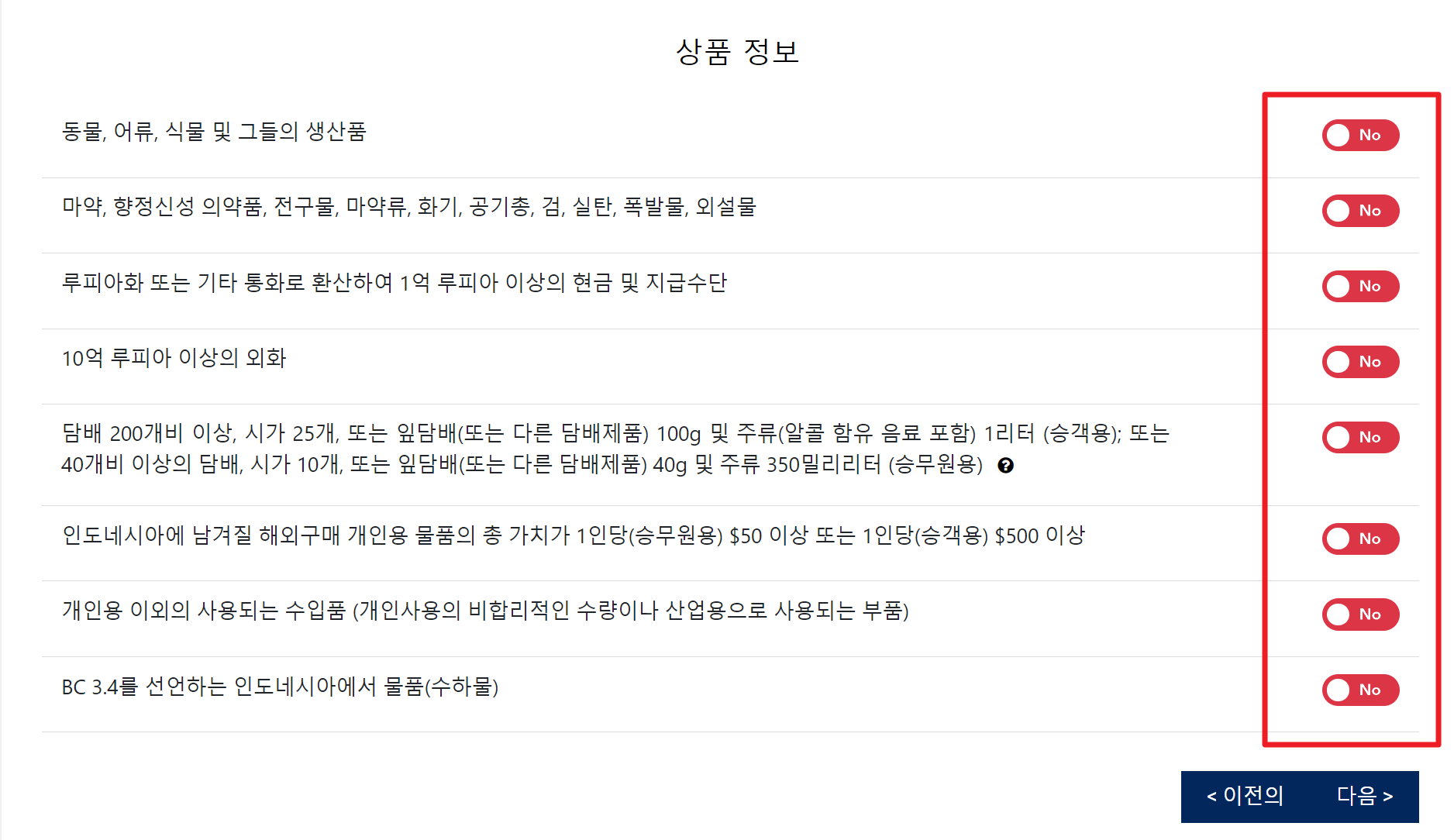 세관 신고할 품목이 있다면 표시해주는데 없다면 다음을 클릭해줍니다.