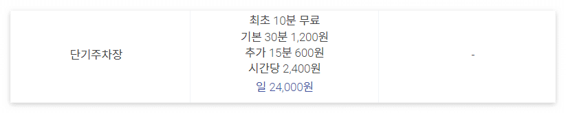 단기 주차요금은 처음 10분은 무료이지만 30분에 1200원이고 하루 온종일 주차를 할 경우 24,000원 이기 때문에 꽤 비용이 높습니다. 따라서 누군가를 배웅하거나 픽업할 때 이용하는 것을 권장 드립니다.