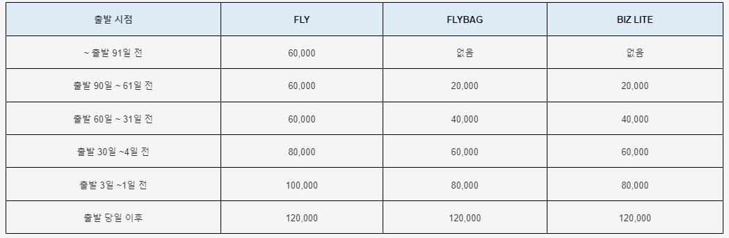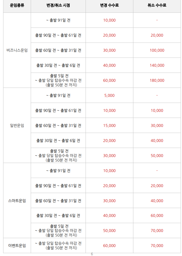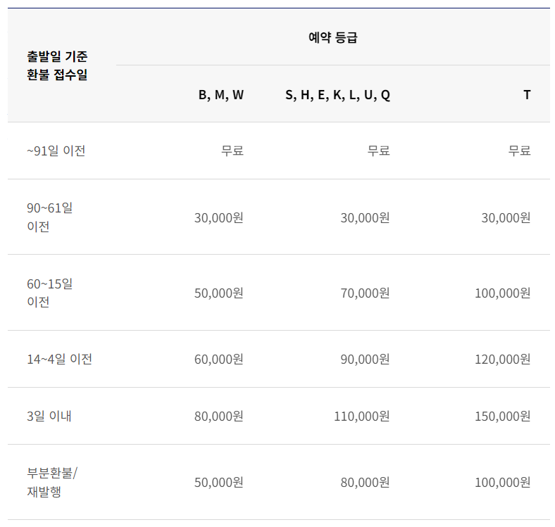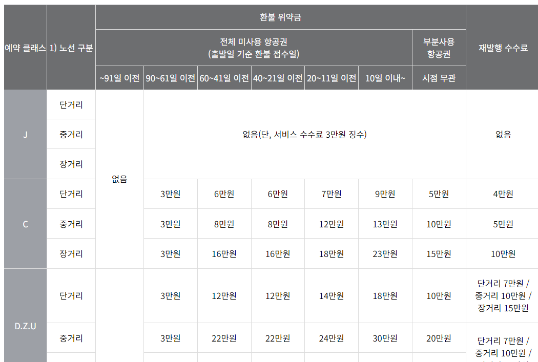대한항공 환불 접수는 91일 이전에 취소한다면 무료이지만 그 이후부터 여행기간이 얼마남지 않은 경우에는 환불 수수료가 아래와 같이 발생될 수 있습니다.
