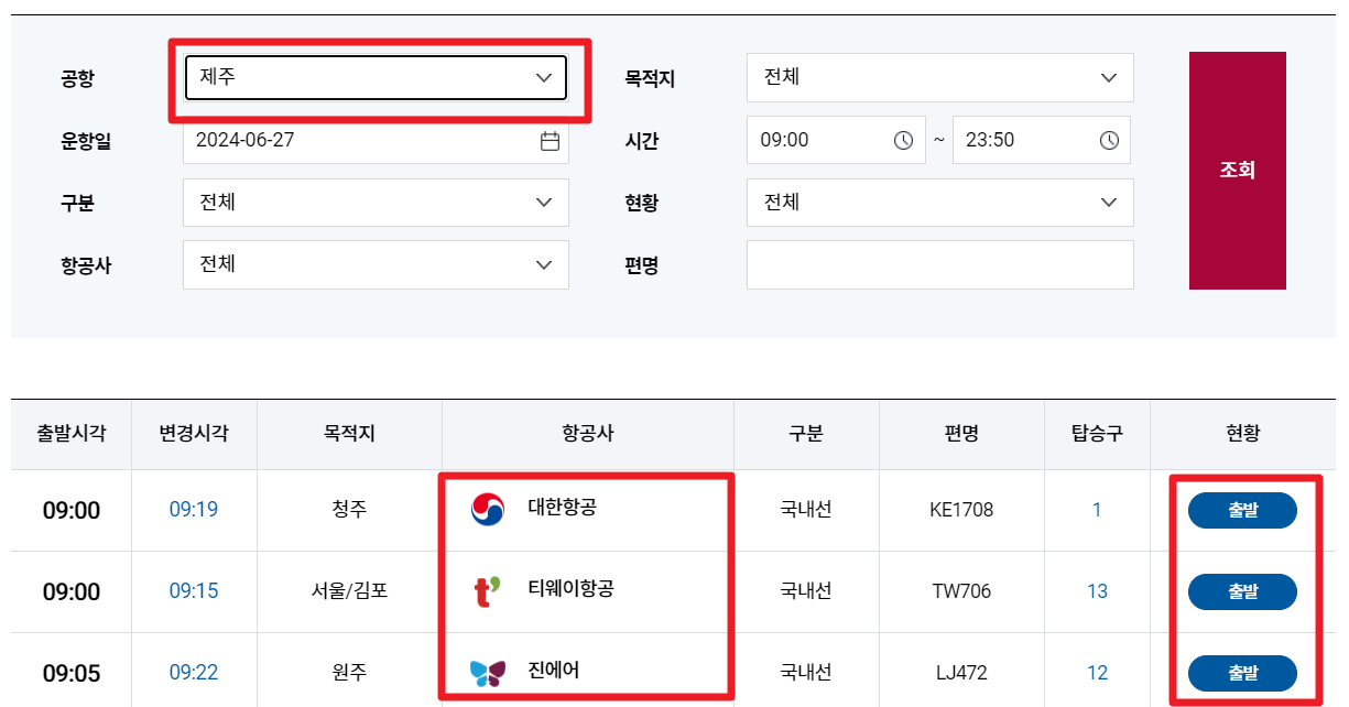 위 버튼을 클릭하시면 제주국제공항 홈페이지입니다. 해당 사이트에서는 제주공항으로 들어오는 많은 항공기 등의 운항스케쥴을 확인할 수 있습니다. 오른쪽 출발 부분을 체크하시면 출발이거나 지연, 그리고 결항으로 확인하실 수 있습니다.