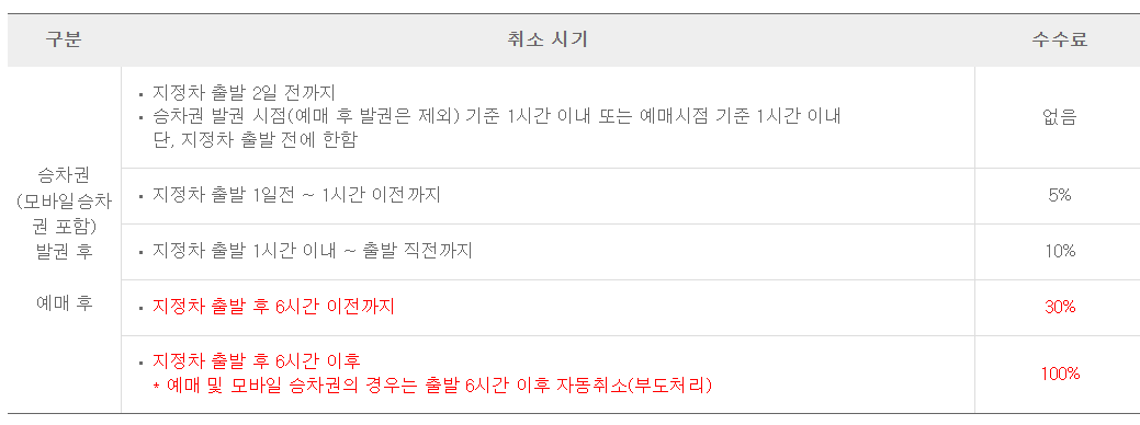 아래 취소 시기에 따라 승차권 취소 수수료를 확인해보시기 바랍니다.