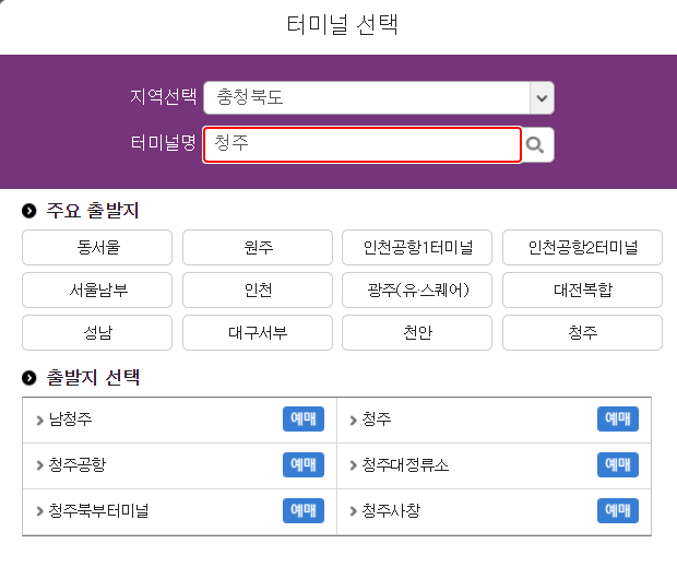 가장 먼저 아래 사이트로 이동하시고 청주로 출발지를 선택해주시기 바랍니다.