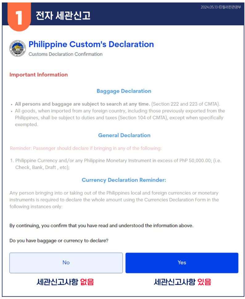 필리핀 세관신고서를 종이 방식으로 비행기 안에서 작성할 수도 있으나 요즘은 디지털 전자신고 방식을 통해 신고가 가능합니다.