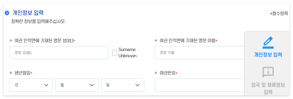 한국어로 되어있기 때문에 개인정보 및 여러가지 인적사항을 적는 것은 크게 어렵지 않습니다. 모든 내용은 한글 또는 영문이름으로 되어있는 부분만 영문으로 작성하시면 되기 때문입니다.