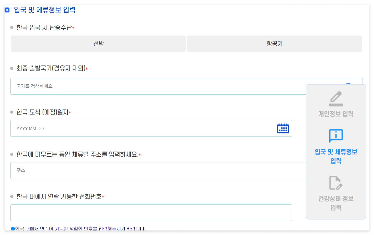 한국입국시 탑승수단은 어떤 것을이용했는지, 그리고 한국에 머무를 때 연락이 가능한 전화번호는 필수로 입력하셔야 합니다.
