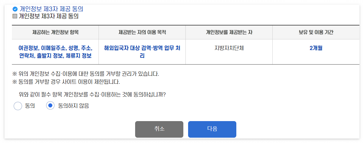여권정보등 민감한 여러가지 개인정보를 모두 동의해야 하며, 해당 동의 절차 진행 후 다음 버튼을 클릭해줍니다.