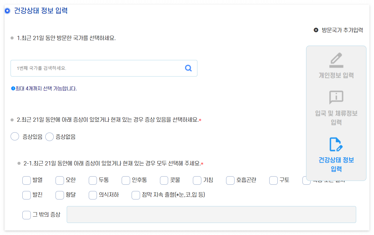 건강상태가 어떤지에 대해 입력하는 란 입니다. 최근 21일동안 방문한 국가는 4개까지 최대로 선택할 수 있습니다. 증상이 있다면 해당하는 증상에 대해 모두 입력해주시면 됩니다.