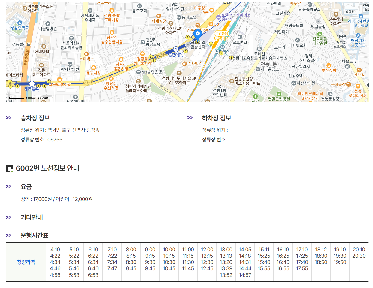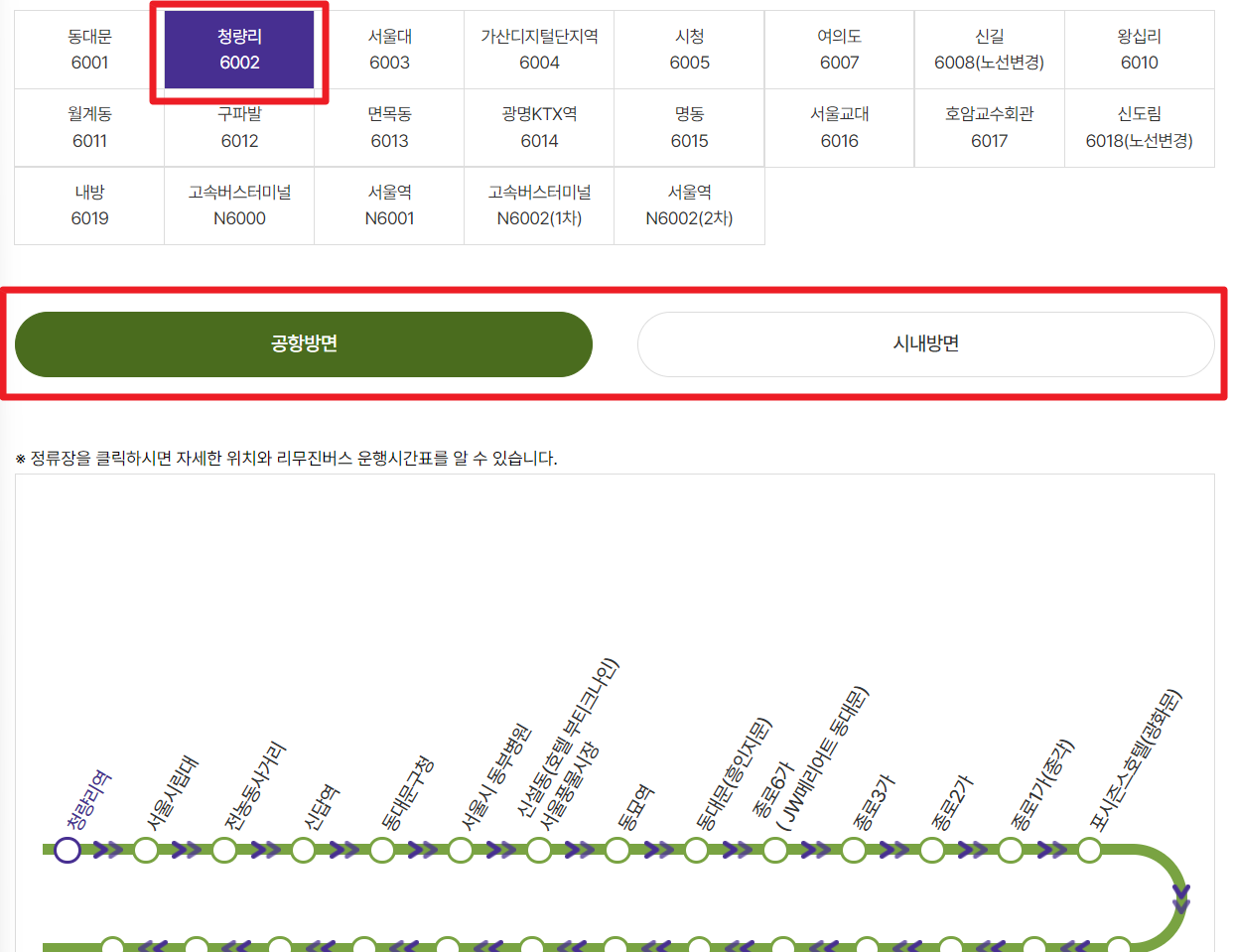 청량리 6002를 클릭하시면 아래 공항방면으로 가는 6002 공항버스 시간표를 확인할 수 있게 노선표에서 정류장을 클릭해주시면 됩니다.